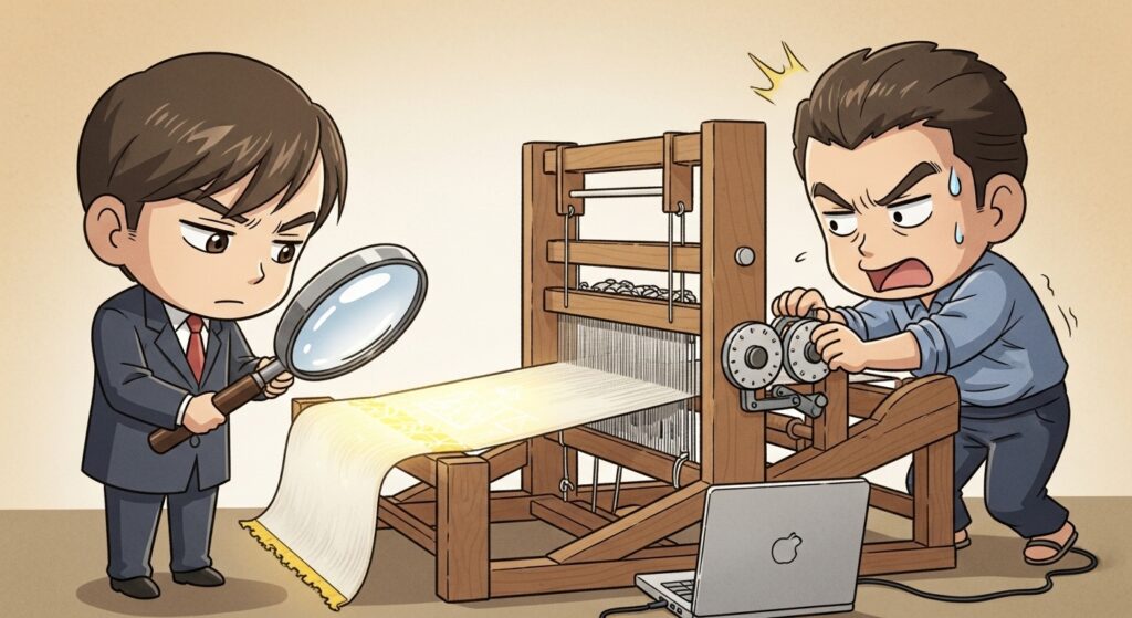 彼らは、約20工程の水平分業というマイクロサービス・アーキテクチャをフル稼働させ、糸の太さ、染めの色合い、織りの組織といった変数を一つひとつ調整し、何度も何度も試作(テストとデバッグ)を繰り返しました。