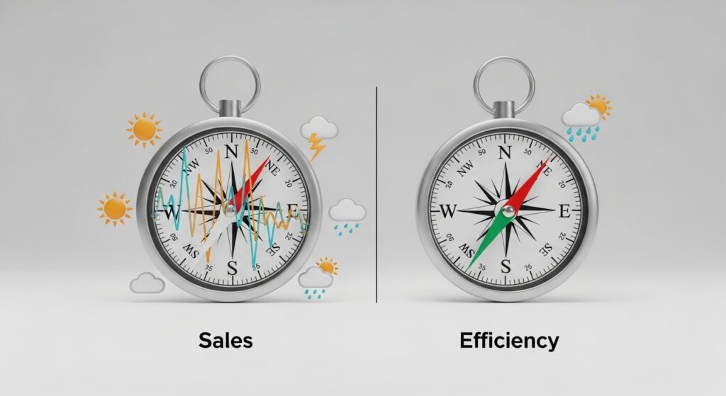 なぜなら、売上とは天候や景気といった、現場ではコントロール不能な「外部要因」に大きく左右される、極めて不安定な指標だからです。ITシステムに例えるなら、サーバーの処理能力を評価するのに、外部ネットワークの気まぐれなトラフィック量だけを当てにするようなものです。