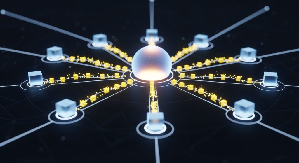 個々の荷物(パケット)は、最短経路を自律的に選ぶのではなく、一度巨大なルーター(ベース)に集約され、太い回線(幹線輸送)を通って、再び末端へと配送される。