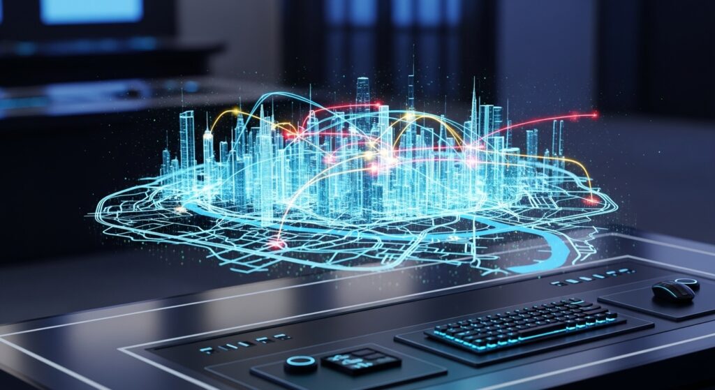 仮想空間上に、リアルな都市や物流ネットワークを完全に再現し、AIシミュレーションを行う。「明日の荷物量はこれくらいだから、トラックは何台、人員は何人必要だ」というリソース配分を、人間が悩む前にAIが弾き出す。